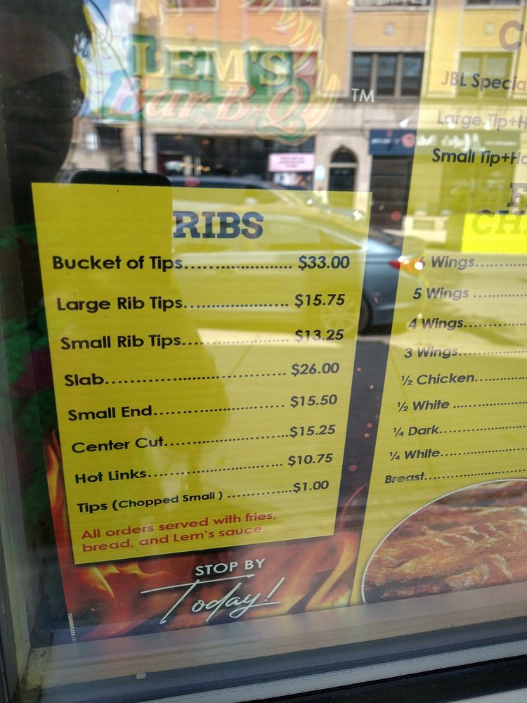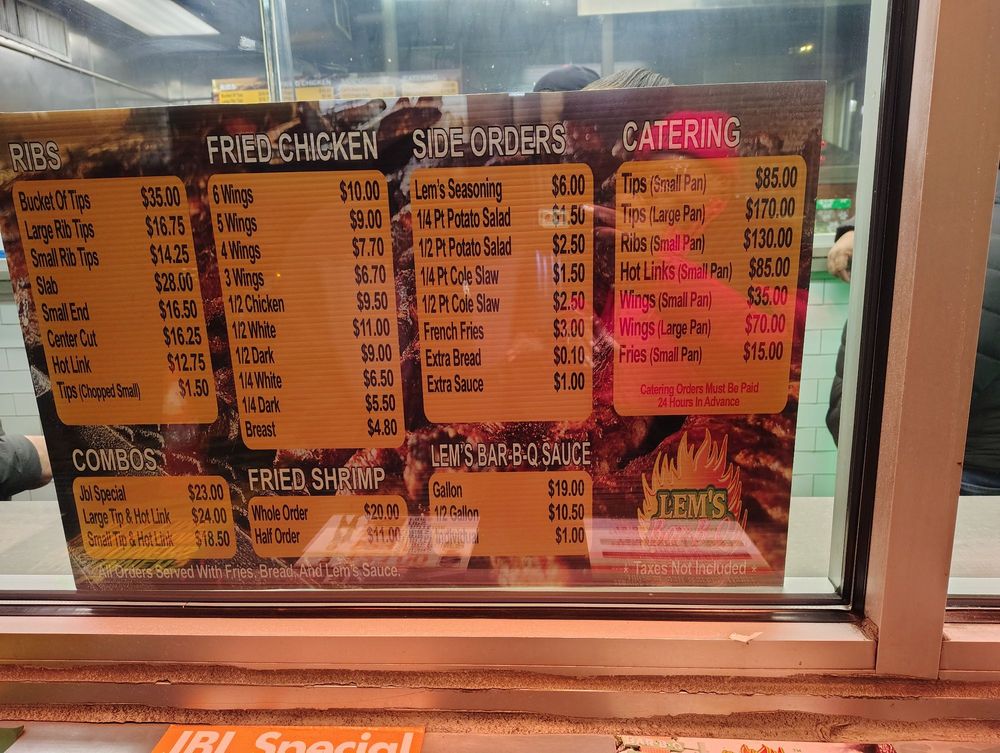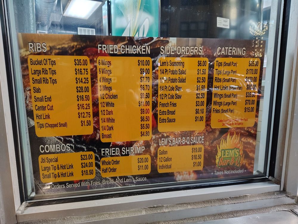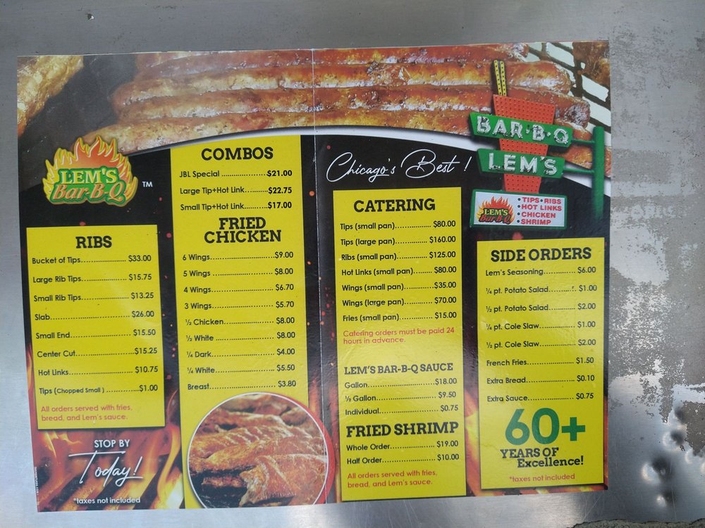 Lem's Bar-B-Q, located in Chicago, is a neighborhood gem offering delicious barbecued center cut ribs and hot links. Customers rave about the flavorful rib tips and chicken wings, highlighting the quality of the meat and outstanding flavor. The JBL special allows patrons to sample a variety of menu items, with generous portions worth the price. While the wait time can be long, the food is well worth it, with the ribs standing out as a must-try dish. The friendly staff and lively atmosphere make for an enjoyable dining experience. Lem's Bar-B-Q is a staple in the community and a top pick for BBQ enthusiasts looking for authentic flavors and a memorable meal.